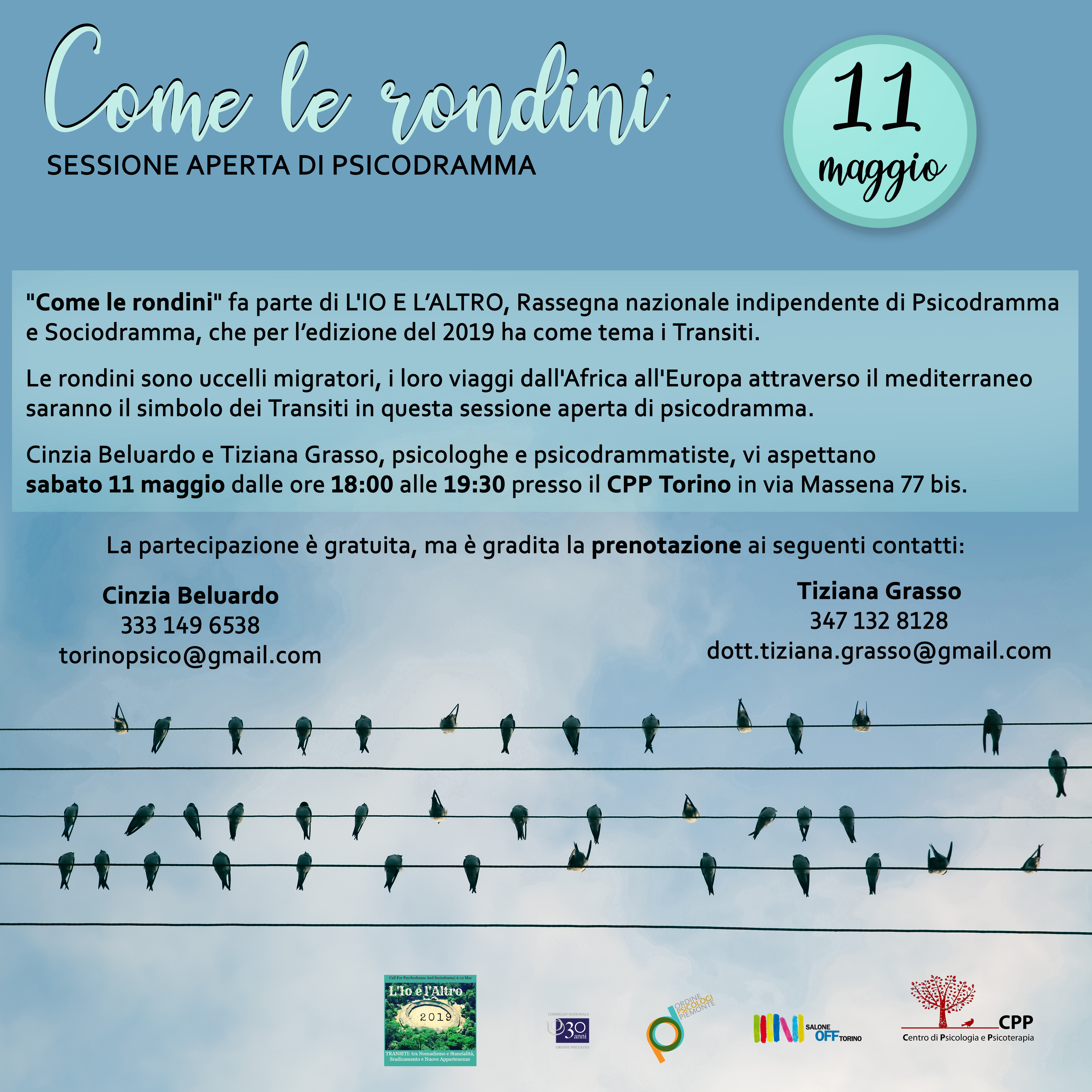 Io e Tiziana Grasso vi aspettiamo sabato 11 maggio dalle h. 18:00 alle 19:30 presso il CPP Centro Psicologia Psicoterapia Torino in via Massena 77 bis (vicinanze stazione Porta Nuova) per la sessione aperta di Psicodramma Come le rondini. L’evento รจ gratuito ma รจ richiesta l’iscrizione.